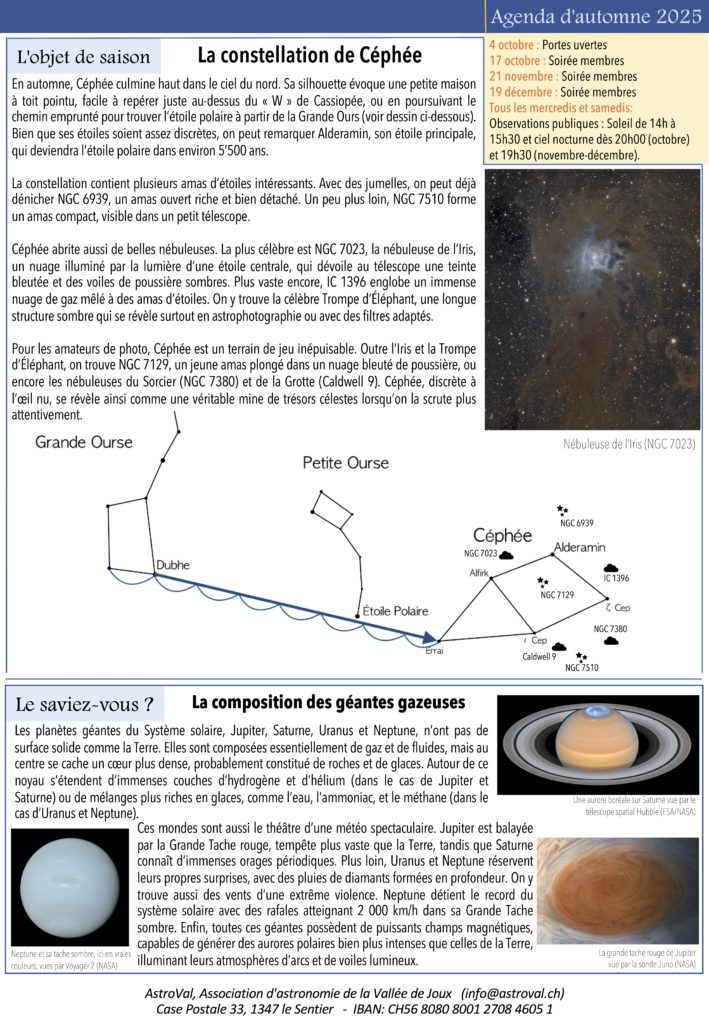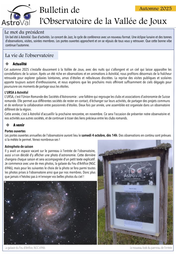 Cet automne 2025 s’installe doucement à la Vallée de Joux, avec des nuits qui s’allongent et un ciel qui laisse apparaître les constellations de la saison. Après un été riche en observations et en animations à AstroVal, nous profitons désormais de la fraîcheur retrouvée pour explorer galaxies lointaines, amas d’étoiles et nébuleuses discrètes. La reprise des visites publiques et scolaires apporte toujours autant d’enthousiasme, et nous espérons que les prochains mois offriront suffisamment de ciels dégagés pour poursuivre ces moments de partage sous les étoiles.